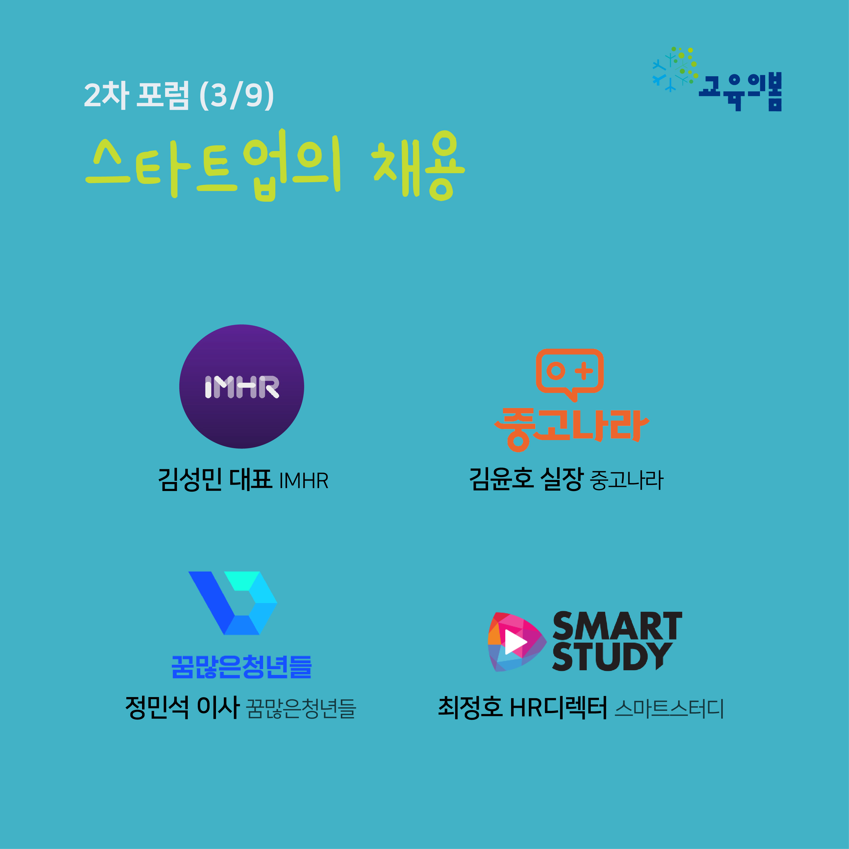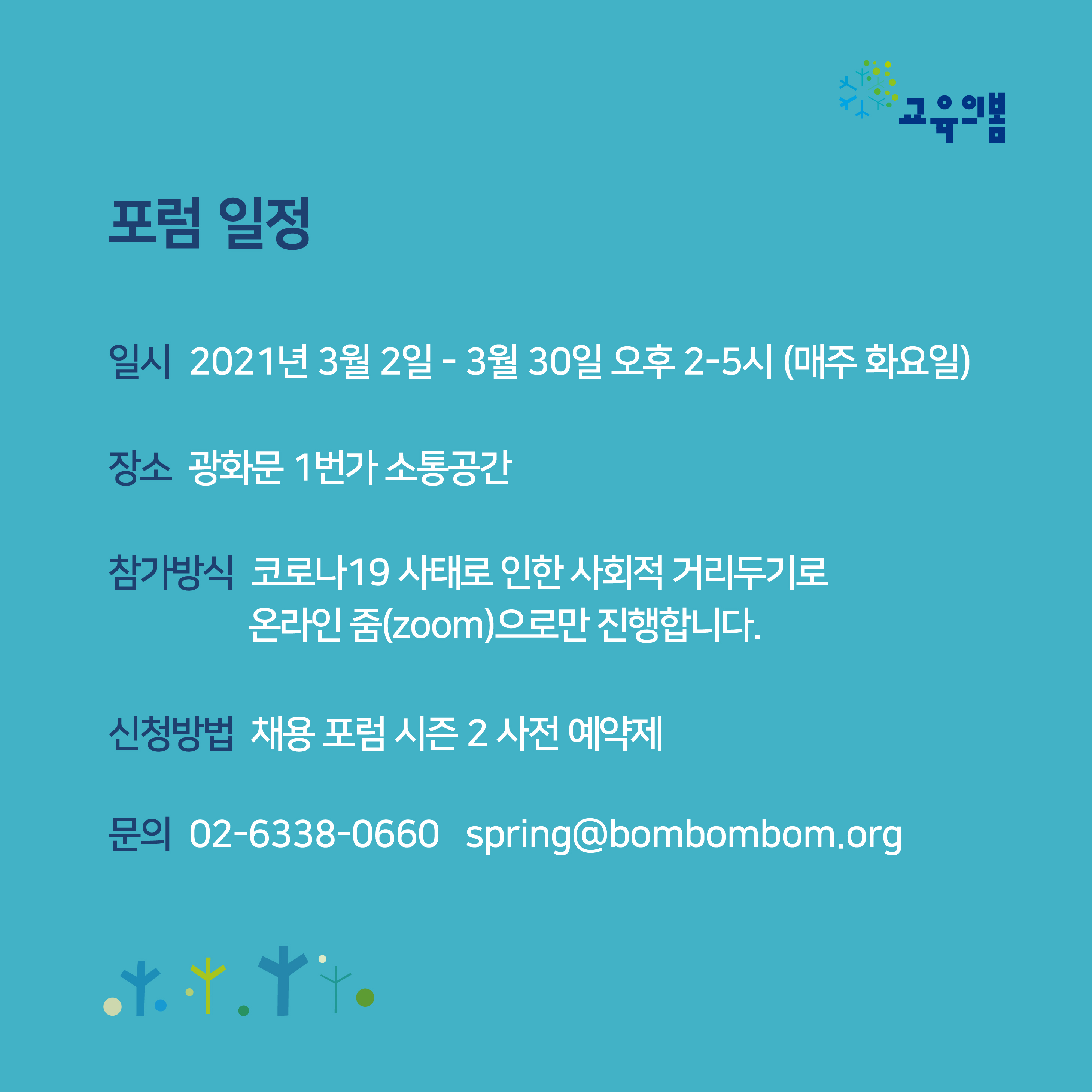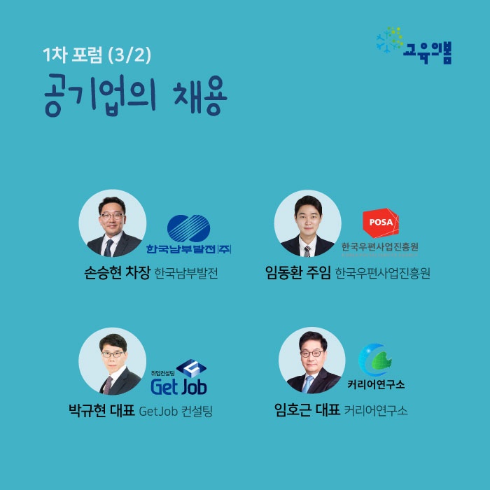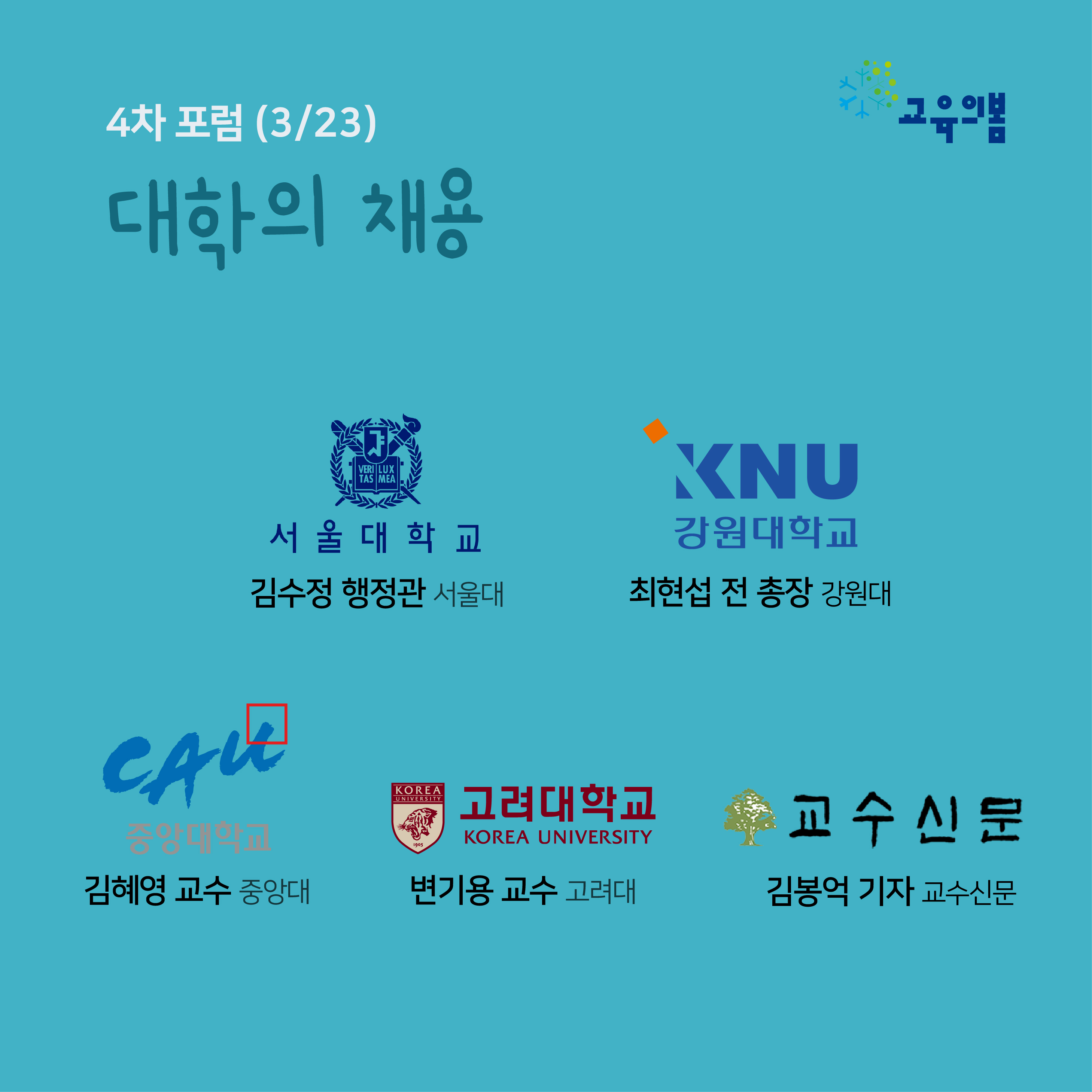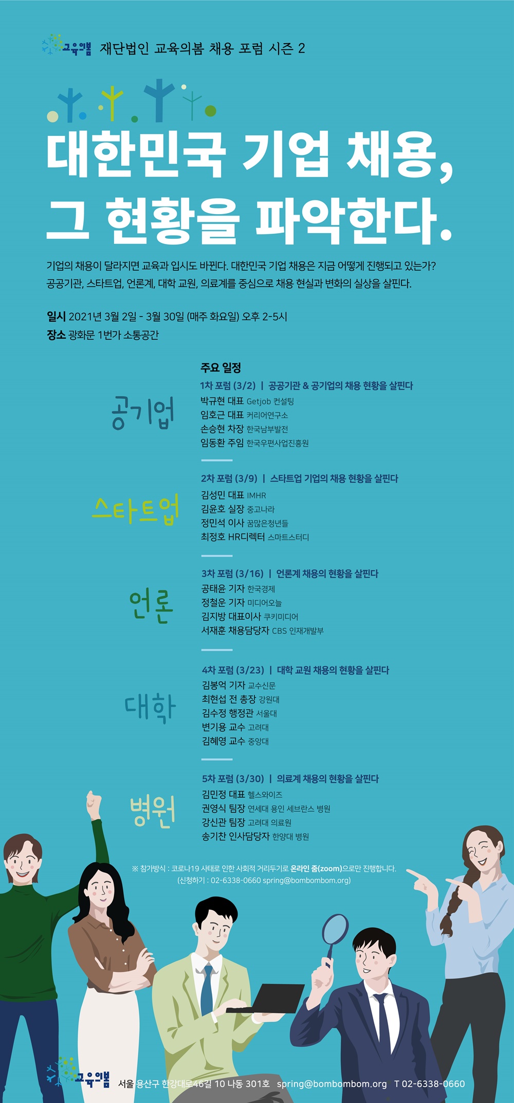 | 김대진 교수님, 재단법인 교육의봄(이사장: 손봉호 서울대 명예교수) 공동대표 송인수 윤지희입니다. 지난 번에 예고해 드린 바와 같이, 오늘은 다음 주 3월 2일부터 한 달 간 진행될 새로운 채용 포럼 행사를 안내드리고자 합니다. 저희들이 채용과 관련된 뉴스레터를 보내드리니까, 적지 않은 교수님들께서 지난 행사만이 아니라 앞으로 진행될 행사도 제 때 정보를 알려 달라는 요청을 하셨습니다. 그래서 이번에 3월 예정된 행사 소식을 보내드립니다.