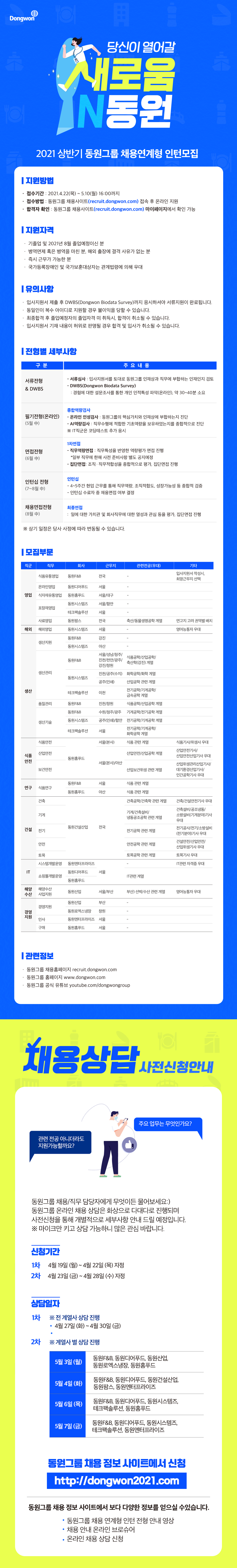 | 제목 | [동원그룹] 신입/경력 채용 온라인 채용상담 안내 | 날짜 | 2021-04-29 | 조회수 | 853 |