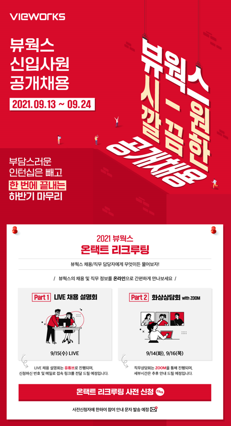 | 제목 | [뷰웍스] 신입채용 공개채용 (온택트 리크루팅) | 날짜 | 2021-09-06 | 조회수 | 963 |